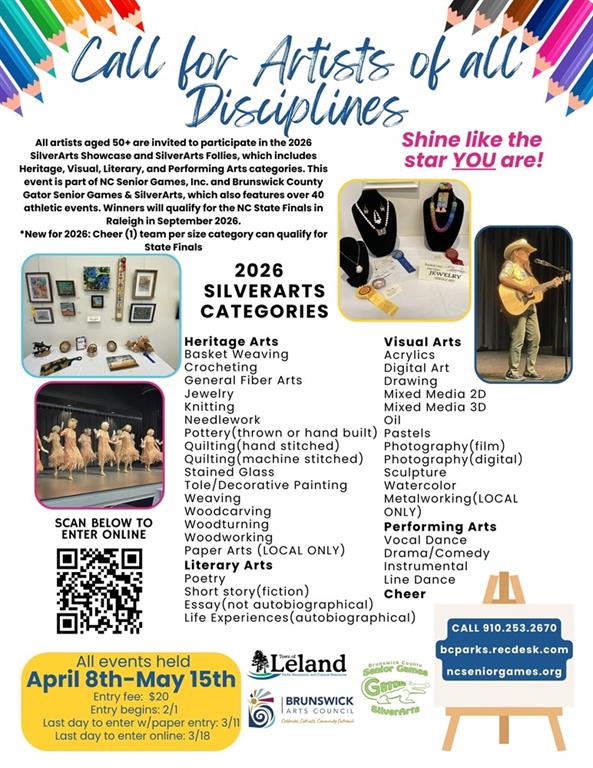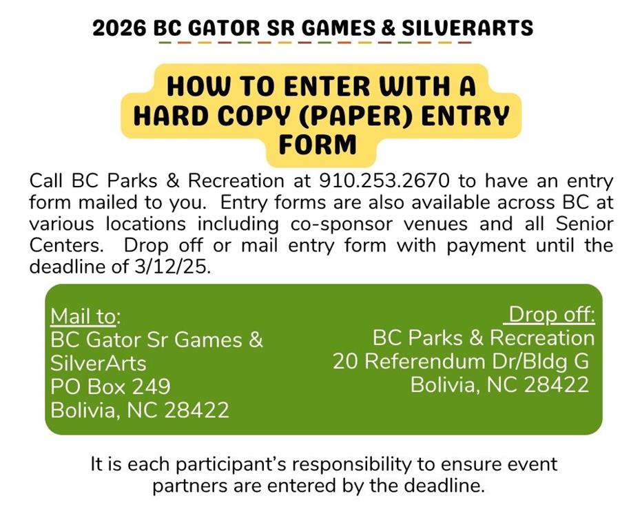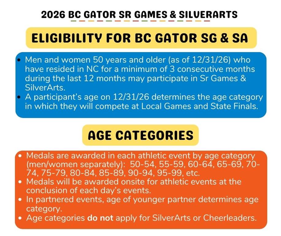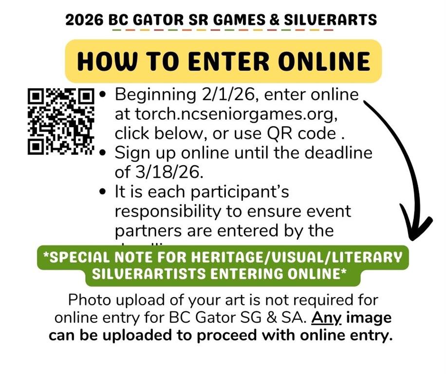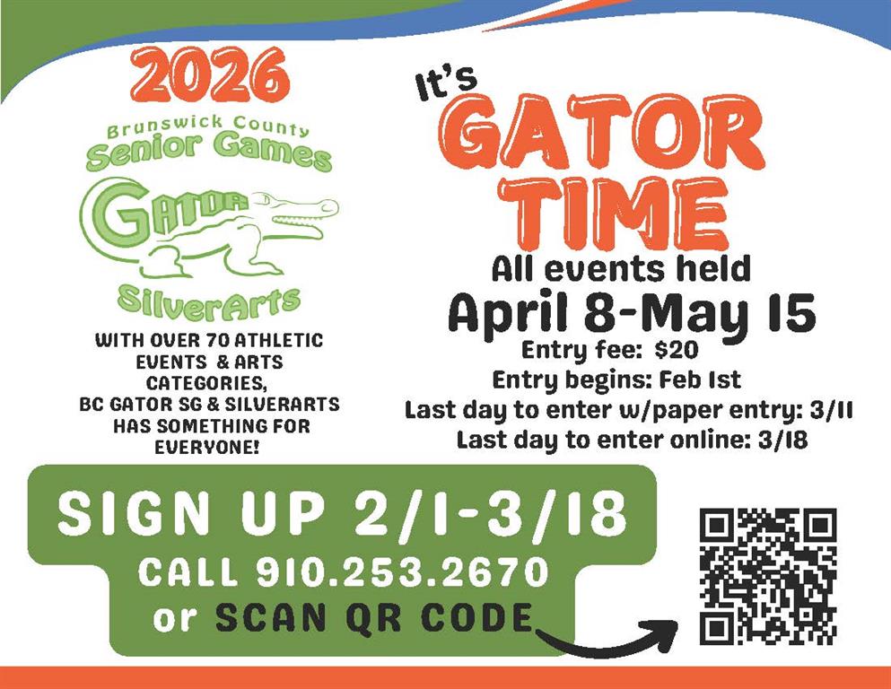 Brunswick County Gator Senior Games also offers competition in SilverArts, which includes all heritage, literary, visual and performing arts. Qualifiers in Brunswick County Gator Senior Games are invited to compete each Fall in the North Carolina State Finals. Brunswick County Gator Senior Games is sanctioned by North Carolina Senior Games and one of 54 local Senior Games offered state wide by the NC Division of Aging and Adult Services. For more information on NC Senior Games, visit www.ncseniorgames.org.