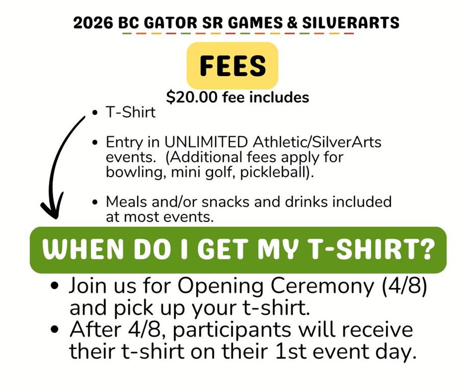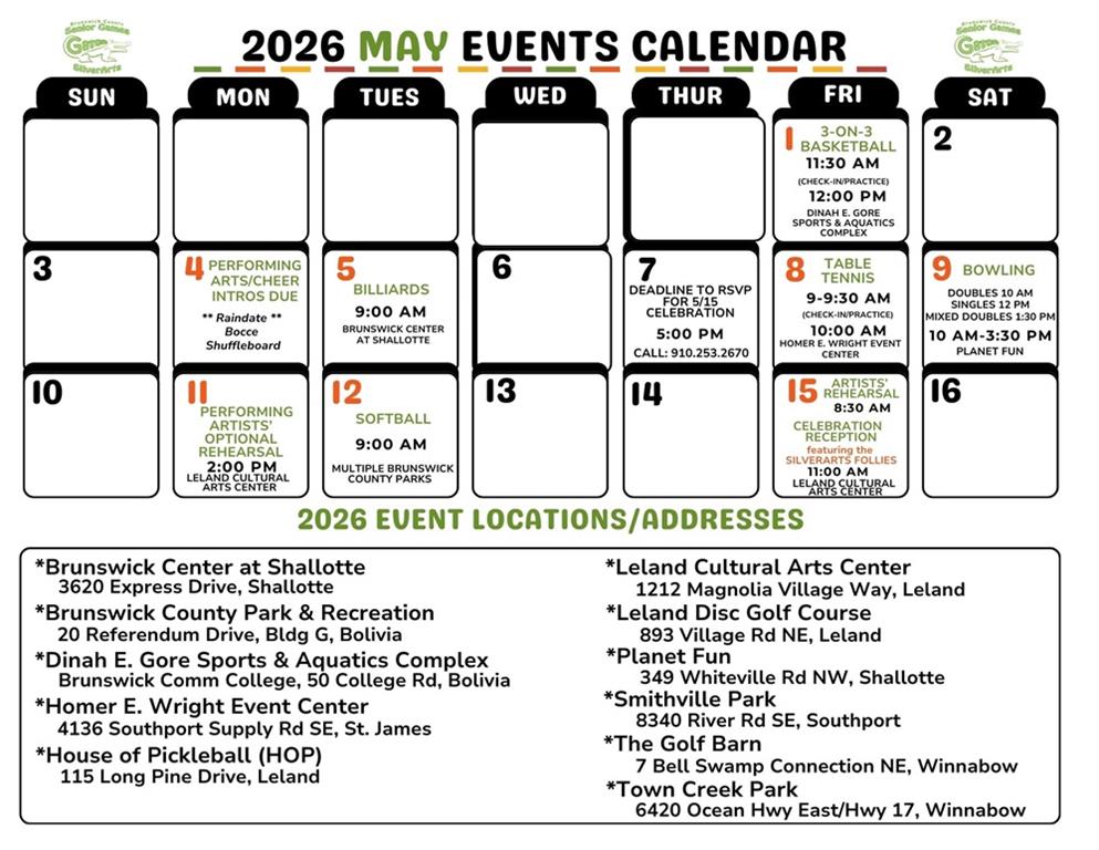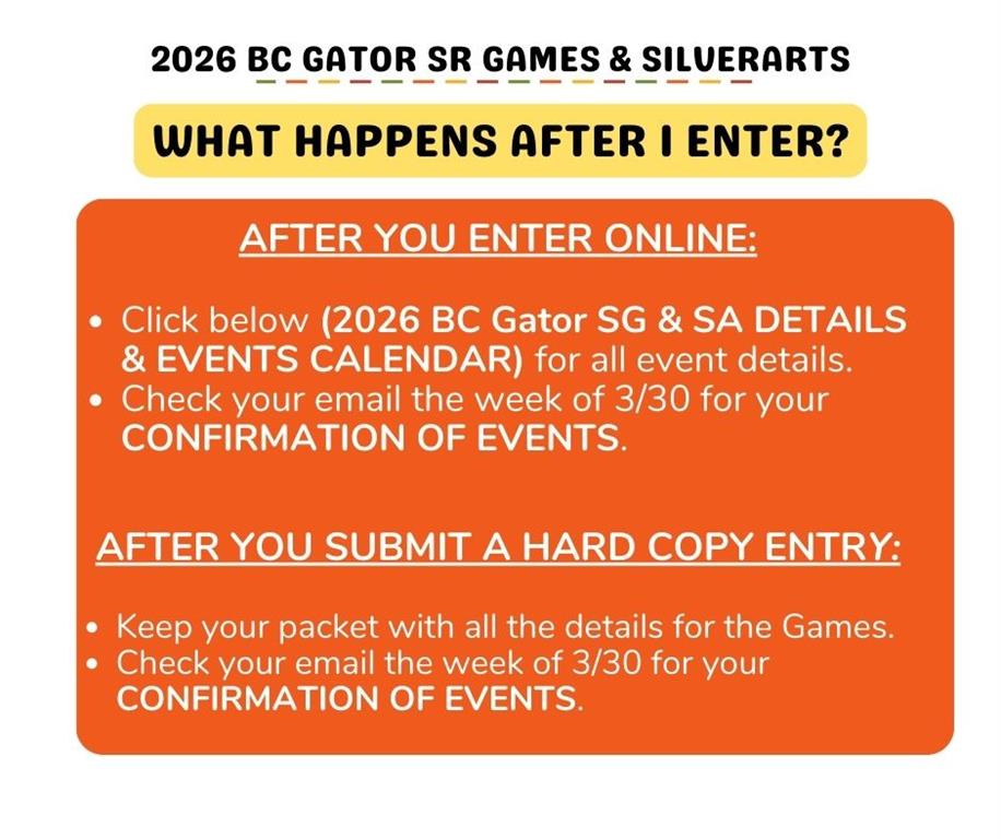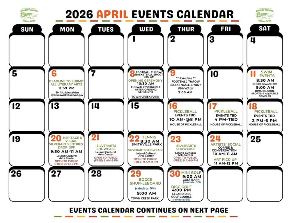 Brunswick County Gator Senior Games also offers competition in SilverArts, which includes all heritage, literary, visual and performing arts. Qualifiers in Brunswick County Gator Senior Games are invited to compete each Fall in the North Carolina State Finals. Brunswick County Gator Senior Games is sanctioned by North Carolina Senior Games and one of 54 local Senior Games offered state wide by the NC Division of Aging and Adult Services. For more information on NC Senior Games, visit www.ncseniorgames.org.