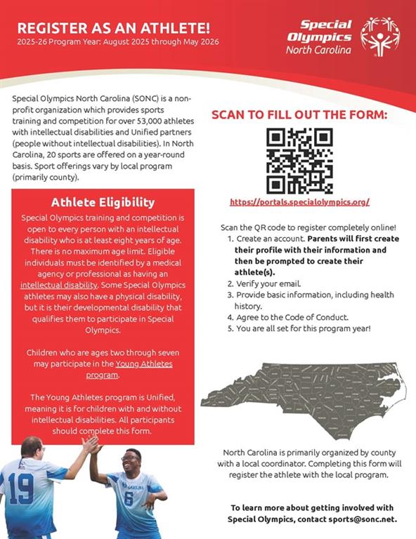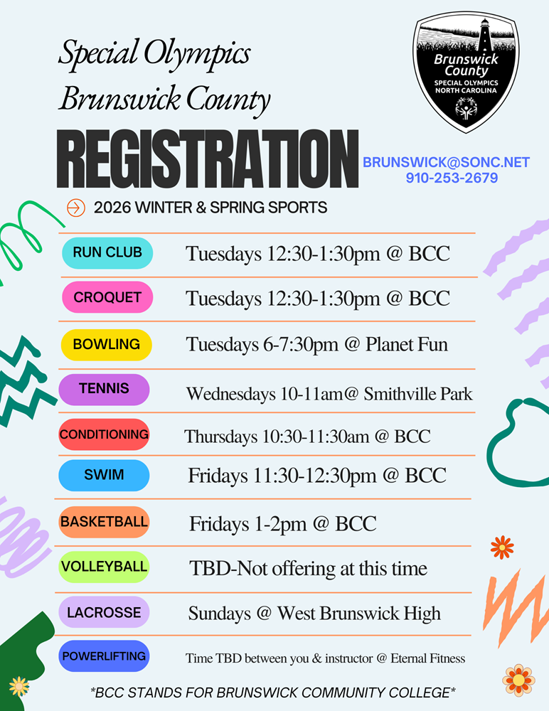 Special Olympics Brunswick County provides year-round sports training and competition for individuals with intellectual disabilities. This program gives children and adults with intellectual disabilities the opportunity to develop physical fitness, demonstrate courage, and experience joy at all levels and at no cost. The program is constantly adding new sports to give athletes many choices and rewarding opportunities to grow physically, socially, and improve their overall quality of life. Like us on Facebook to stay updated on all Special Olympics Brunswick County activities.