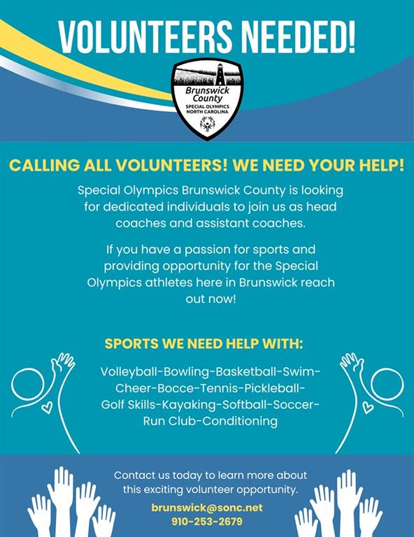 If you are interested in learning how to volunteer or coach for Special Olympics Brunswick County, please complete this volunteer interest form .